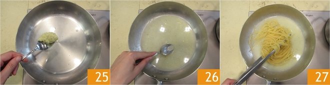 Add some of the lemon cream 25 and stir to melt it 26. Drain the pasta al dente and transfer it to the sauce 27.