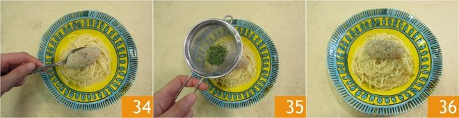 Place it on the pasta 34, then use a sieve to sprinkle basil on top 35. The spaghetti is ready; you just need to serve it 36.