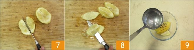 Now cut them into wedges 7, remove the pulp, seeds, and white part 8. You should only keep the yellow part, the peel. Transfer it to a small bowl and add a little cooking water 9.