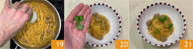 With the heat off, stir in a dash of oil 19. Plate and garnish with fresh basil leaves 20. Your spaghetti with sausage meatballs and yellow tomato sauce is ready to be served 21!