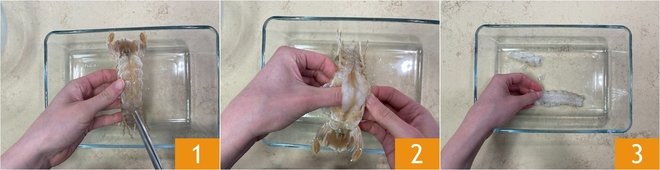 To prepare the spaghetti with sea urchins and marinated mantis shrimp, start by How to clean mantis shrimp: remove the shell by cutting along the back with scissors 1, extract the flesh 2, and set it aside 3.