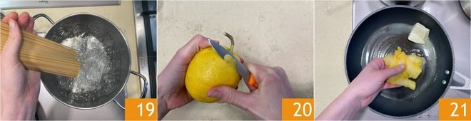 Cook the spaghetti, leaving them 2 minutes before the time indicated on the package 19. Meanwhile, take the lemon zest 20, being careful not to take the white part, which would be bitter. In a pan, melt 3.5 tbsp of butter over very low heat with the lemon zest 21.