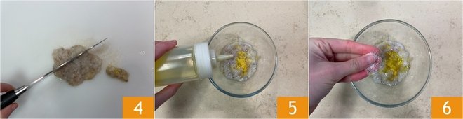 Roughly chop the mantis shrimp flesh 4 and season it with lemon zest, oil 5, and salt 6.