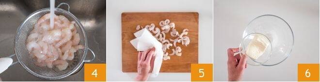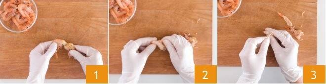 To prepare spaghetti with shrimp, stracchino, and saffron, first, take care of cleaning the shrimp. Put on a pair of latex gloves, then apply light pressure to remove the head 1, tail, and shell 2. Then using a toothpick, gently remove the black thread 3.