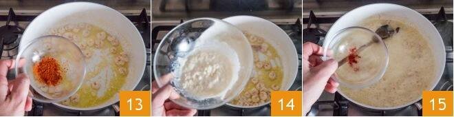 and when it has completely evaporated, add some chili powder 13, the stracchino cream 14, and the saffron 15.
