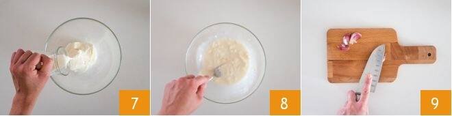 add the milk 7 and work it with a fork until you get a creamy mixture 8. Then crush a garlic clove using the flat side of a knife 9.