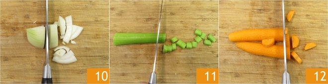 Prepare the other ingredients for the cooking base: peel and coarsely chop the onion 10, celery 11, and carrots 12, then crush the unpeeled garlic clove.