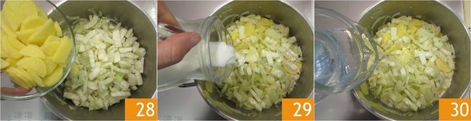 Add the potatoes 28 and brown everything for 5 minutes, seasoning with salt and pepper. At this point, pour in the milk 29 and cover with water 30.
