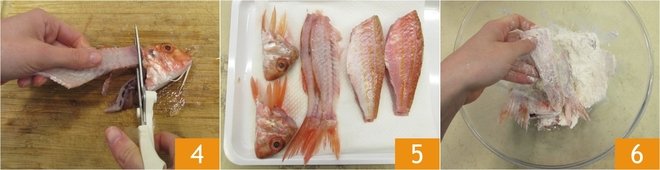 Remove the liver portion and cut the bones into 2 pieces 4, then clean the head and rinse everything. Once you have separated the fish fillets from the head and bones 5, set the fillets aside and flour the rest in a bowl 6.