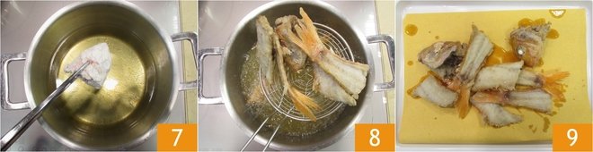 Heat the seed oil in a small pot and fry the fish scraps 7. When they are golden, drain 8 and transfer to frying paper 9.