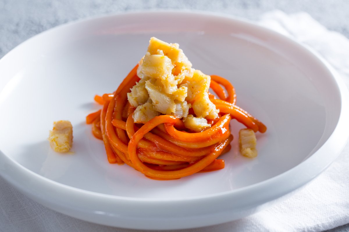From the union of the simplest ingredients, a gourmet dish can be born, like the dish by Caterina Ceraudo, 1 Michelin star with her restaurant "Dattilo" in Calabria: spaghettoni with bell pepper cream and salt cod. Just talking about it, you can feel all the creaminess and imagine the intense flavor of this dish with sincere and genuine ingredients, just like scarpariello, delicious and tasty, perfect for all occasions. The important thing is the choice of products first of all: never leave the choice of pasta to chance, in this case spaghetti, or rather spaghettoni! Furthermore, there are no better allies in the kitchen than the ingredients offered by the seasonal garden (or pantry), without adding too many other ingredients, extraordinary results can be achieved in terms of texture, taste, and aroma. In this pasta, for example, the bell peppers are simply grilled and then blended to obtain the sauce that will be used to dress the spaghetti. For this reason, it is good to choose very flavorful, organic, and perhaps locally sourced bell peppers. Besides the bell pepper cream, another protagonist of the dish is certainly the salt cod: chef Ceraudo advises us to cook it for just a few minutes, precisely to not alter its taste and achieve unique tenderness. For those who would like to try, she also proposes not cooking it at all and using it as if it were tartare! Try the spaghettoni with bell pepper cream and salt cod yourselves, an easy and quick-to-make first course but excellent in its simplicity! Feel like a chef for a day by following all our suggestions and don't miss these tasty variations on the theme: