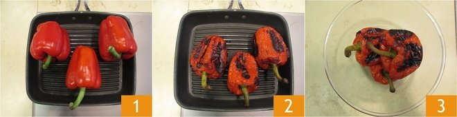 To prepare the spaghettoni with bell pepper cream and salt cod, first, wash the bell peppers well and dry them. Heat a grill on the stove, then place the bell peppers on top 1. Cook them for about 40 minutes, turning them often, so they don't burn. When they are cooked, transfer them to a bowl 3.