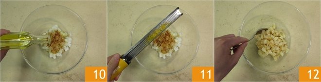Add a drizzle of oil 10 and the grated zest of one lemon 11. Mix well to combine all the flavors 12.