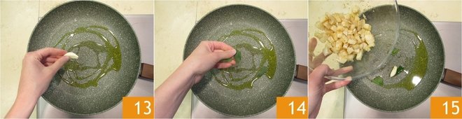 Heat a dash of oil in a pan, add the garlic 13 and the torn bay leaves. Let it heat up and add the salt cod 15.