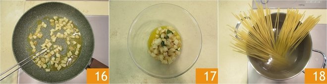 Cook very briefly, then remove the garlic 16 and transfer to a bowl 17. Cook the spaghettoni in plenty of boiling, salted water to taste 18.