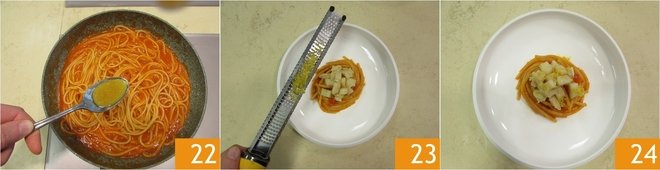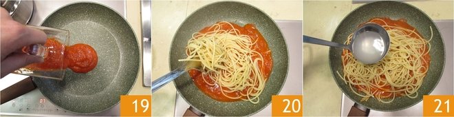 Pour the bell pepper cream into the pan 19 and heat it. Drain the spaghettoni al dente and transfer them to the pan 20, keeping aside a bit of cooking water to add immediately after 21.