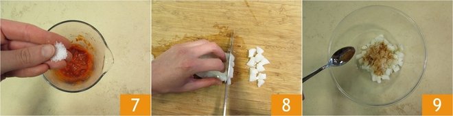 Once you obtain a homogeneous cream, adjust the salt 7 and set aside. Now move on to the salt cod, cut it into cubes 8 and transfer it into a bowl. Add some chili powder 9.
