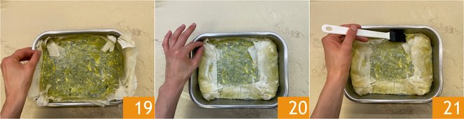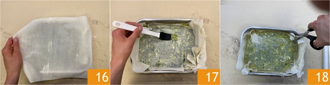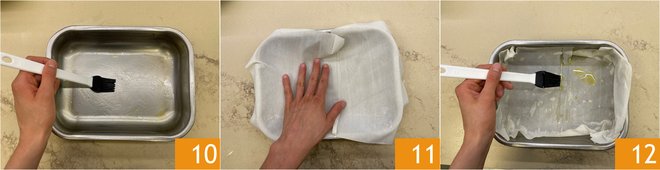 Brush a 9.5x6.5 inch (2.5 inches high) baking dish with a little oil 10, then place a sheet of phyllo dough on the bottom 11 and brush again with oil 12.