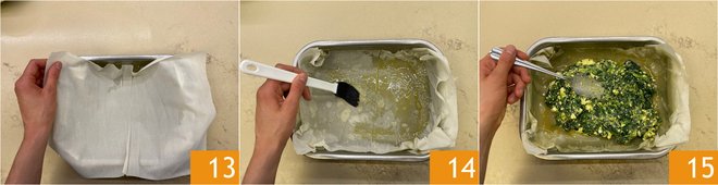 Add another layer of phyllo dough 13 brushed with oil 14, then proceed in the same way to make 2 more layers, for a total of 4. At this point, pour the filling 15 and distribute it well throughout the pan.
