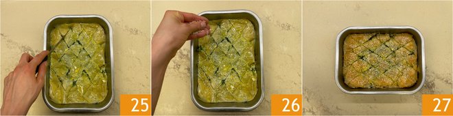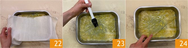 Add a final sheet of phyllo dough to cover everything 22 and brush one last time with oil 23. Make diagonal cuts across the entire surface 24.