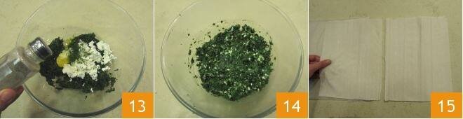 Add pepper 13 and stir to mix the ingredients well 14. Preheat the oven to 355°F. Take the phyllo dough and separate it to obtain two sheets, each consisting of 3 layers of dough 15.