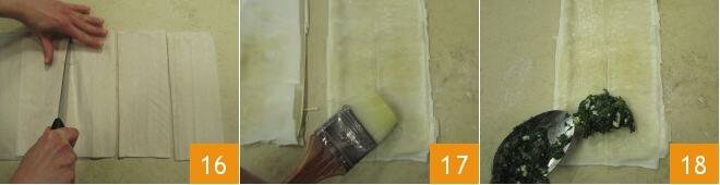 Divide each of these sheets into 4 strips about 4 inches wide, which will then have a rectangular shape 16. Melt the butter in a saucepan and brush the surface of each rectangle with the melted butter 17. Take a spoonful of the spinach mixture and place it at the base of one of the rectangles 18,