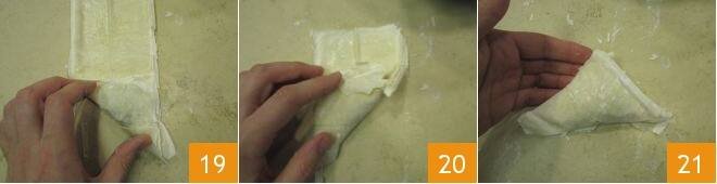 then fold the dough over the filling, aligning the base with one of the sides to form a triangle 19; continue folding the dough this way until you reach the end of the rectangle 20. Gently press to seal the parcel 21 and place them on a baking sheet lined with parchment paper, with the opening facing down.