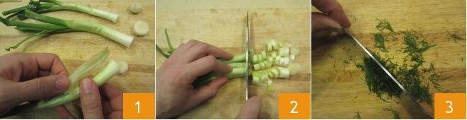 To prepare the spanakopitakia, first clean the vegetables: rinse the scallions, trim the base, remove the outer layer 1, and slice them into rings 2. Then finely chop the dill 3 and rinse the spinach under running water.