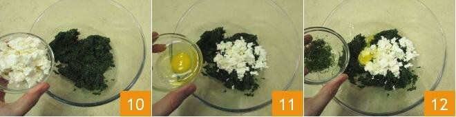 Pour the chopped spinach into a bowl, add the crumbled feta by hand 10, an egg 11, and the chopped dill 12.