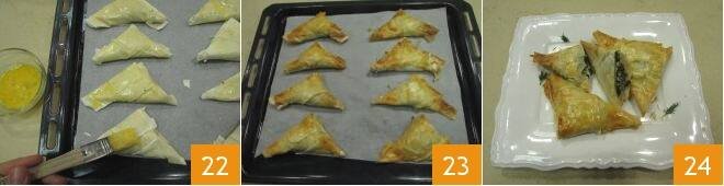 Brush the parcels with the beaten egg 22 and bake in a preheated oven at 355°F for about 20 minutes until they turn golden brown 23. Your spanakopitakia are ready to be enjoyed 24!