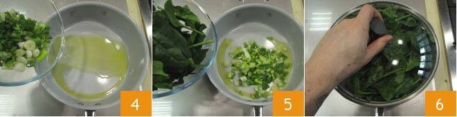 Heat the oil in a pan, add the scallions 4 and spinach 5, cover with a lid 6, and cook over medium heat for 10 minutes.