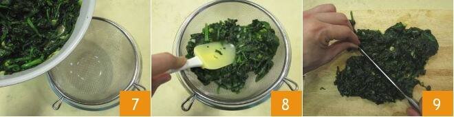 When the spinach is cooked, transfer it to a strainer placed over a bowl 7 and press with a spatula to release excess water 8. At this point, transfer the spinach to a cutting board and chop finely with a knife 9.