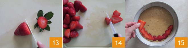 Clean the strawberries well, remove the leafy part, and cut into slices about 1/4 inch thick 14. Decorate the cake surface by arranging the strawberries in a wheel pattern 15