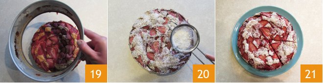 Once cooled, remove the cake from the mold 19, decorate with powdered sugar 20, and serve 21!