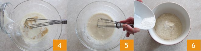 When well incorporated, add the almond milk 4, continuing to mix 5. In another bowl, pour the spelt flour and add the baking powder 6.