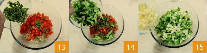 When the spelt is cooked, drain it and rinse it quickly under cold running water (10-11). Then place it in a bowl and add the cherry tomatoes 12