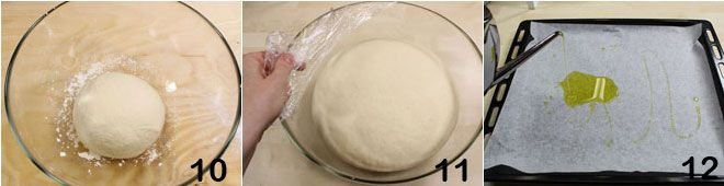 Put the obtained dough in a bowl sprinkled with a little flour, cover with plastic wrap, and let it rise for at least two hours in the oven turned off but with the light on 10. After the indicated time, the dough will have doubled in volume 11. At this point, take a baking sheet with a sheet of parchment paper and sprinkle it with 2 tablespoons of oil 12,