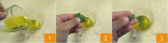 To prepare the spiced beef salad and Grana Padano, first make the marinade for the meat: pour the olive oil into a tall, narrow glass 1, add the mint leaves 2, thyme 3,