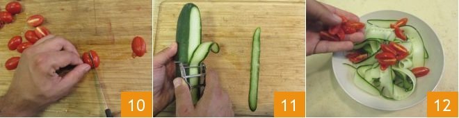In the meantime, focus on the rest of the dish: wash and then quarter the cherry tomatoes 10, peel the cucumber and slice it thinly with a vegetable peeler 11. Place the cucumbers in a bowl and add the chopped cherry tomatoes 12.