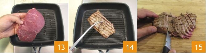 Now you can cook the meat: after marinating, cook the fillet on a very hot grill for about 3-4 minutes on each side (13-14). Transfer the fillet to a cutting board, let it rest for a few seconds, and slice it thinly across the grain 15.