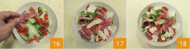 Now you can complete the salad: lay the slices of meat over the cucumbers and tomatoes 16, add the Grana Padano DOP shavings 17, season with a drizzle of oil, salt, and pepper, and finally, garnish with a few fresh mint leaves. Your spiced beef salad and Grana Padano is ready to be enjoyed 18!