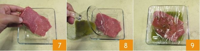 Clean the beef fillet by removing any fat or connective tissue, then transfer it to a container 7 and pour the herb and oil emulsion over it 8. Cover with plastic wrap and let it marinate at room temperature for about 15 minutes 9. You can turn the meat after 6-7 minutes to ensure the other side is well coated in the marinade.