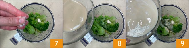 Place the drained chickpeas in a blender, then add almost all the broccoli, reserving some for decoration 4. Add the lime juice 5, garlic, and oil 6.