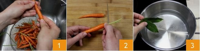 To prepare the spiced carrots, start by thoroughly washing the baby carrots one by one under running water 1. Then place them on a cutting board and trim them with a small knife, removing the green stem 2. Take the steamer and fill it halfway with water (if you don't have one, you can use a large pot and an aluminum colander), heat the water over medium heat, and in the meantime, add the bay leaves 3.