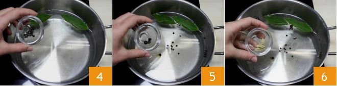 Then add the peppercorns 4, juniper berries 5, cloves, and cardamom seeds 6.