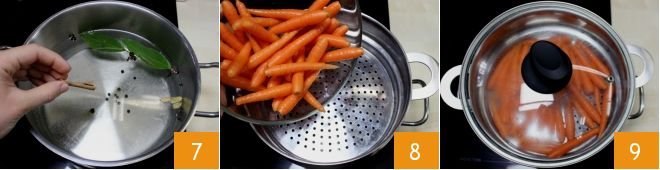 Finally, add the cinnamon stick 7. When the water starts to simmer, place the steamer basket on top. Once the basket is hot, add the carrots 8. Cover with a lid and let cook for about 20 minutes 9.
