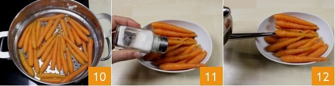 When the baby carrots are cooked 10, transfer them to a serving platter. Salt 11 and pepper to taste. Finally, drizzle with a bit of oil 12 and if you like, you can season your baby carrots with a grating of nutmeg and ground cinnamon!