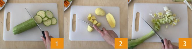 To prepare the spiced stewed vegetables, trim the washed zucchini and slice it into rounds 1. Peel the potato, wash it, and dice it 2. Peel the carrots and cut them into sticks. Peel and slice the leek 3, transfer it to a colander, wash it, and let it drain well.