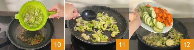 Reduce the heat of the pan with the spices and add the leek 10. Stir 11 and sauté for a few minutes. Now add the zucchini and pumpkin 12, stir again, and cook for a few minutes.