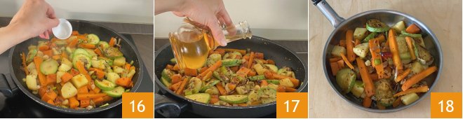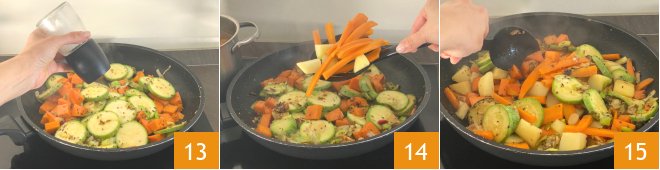 Salt the vegetables 13, then use a slotted spoon to lift the potatoes and carrots and transfer them, gradually, to the pan along with the other vegetables 14, stirring gently 15.